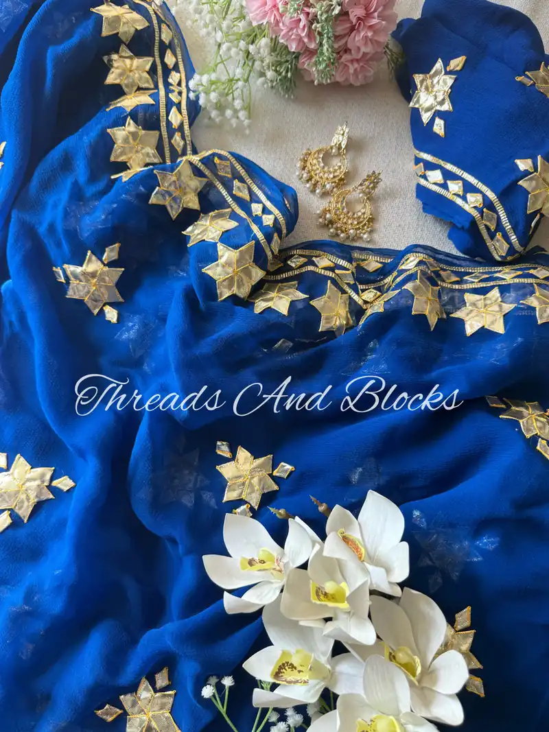 A striking royal blue saree on diamond chiffon, with a beautiful border made of gold gota flowers and kachi gota Patti, and floral buties all over. The saree comes with a running blouse piece in Italian crepe, with light work on sleeves.